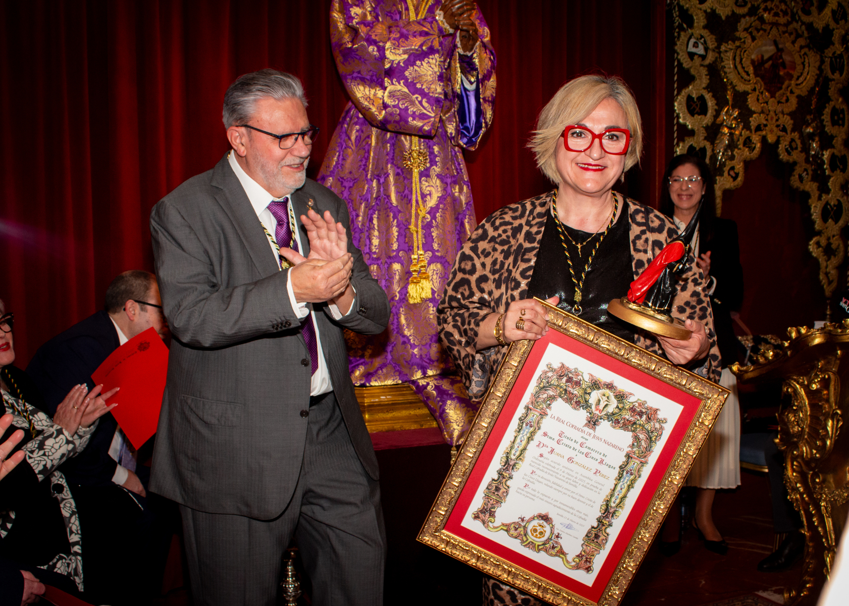 Ambos recibieron el reconocimiento entre muestras de cariño de los asistentes, simbolizando el agradecimiento de toda la Cofradía por su vinculación incondicional.